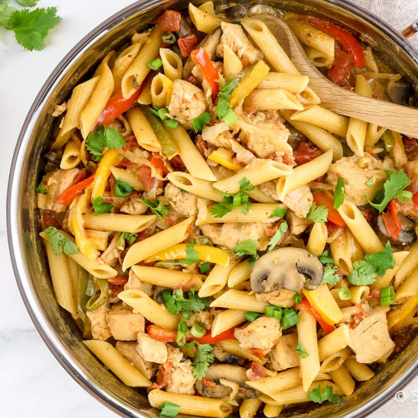 Spaghetti topped with grilled chicken, cooked with peppers, onions, mushrooms, olive oil, and homemade tomato sauce.