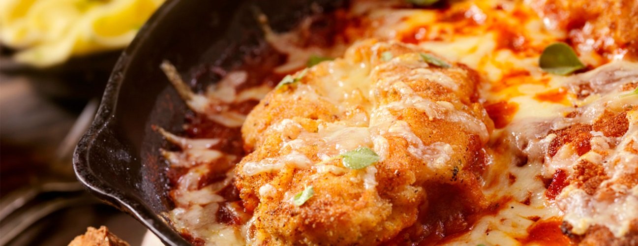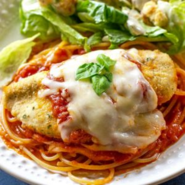 Fresh Chicken breast baked in a homemade tomato sauce and cheese. Served with side Spaghetti.