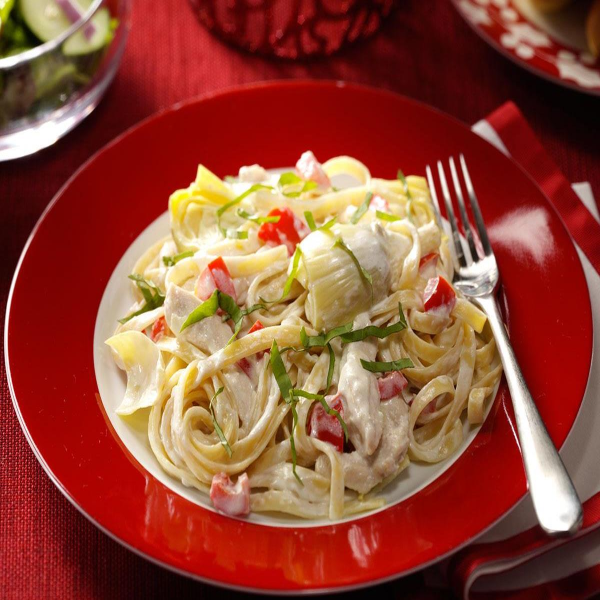 Fettuccini mixed in a specially blended cream sauce and tender grilled or crispy chicken.